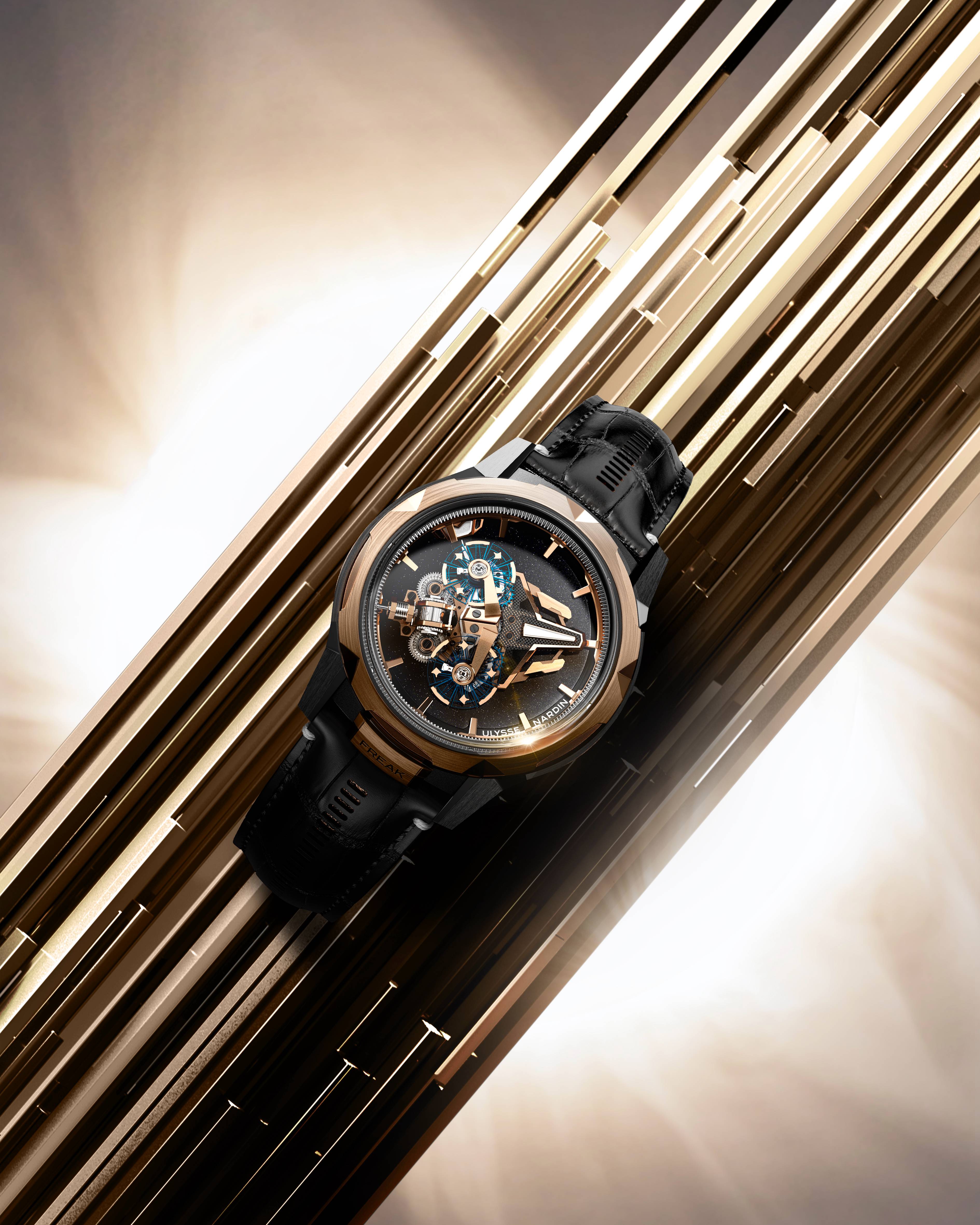 雅典表的技术团队将3D立体设计提升至全新境界。Freak S奇想系列腕表采用了雅典表首个倾斜式双振荡器设计,这一装置亦是品牌全新自产UN-251机芯最突出的标志。其中,两个超大号硅制摆轮分别固定于不同的平面,仿佛分置于两个发射台,连接两者的差速器则获取两个摆轮的平均速率。两个摆轮所在的平面间呈20°夹角,附有惯性块,通过火箭尾翼造型的玫瑰金板桥连为一体。双摆轮以2.5赫兹的频率不断振动,仿佛一对翩然起舞的探戈舞者,又如同两组动力强劲的涡桨发动机,使时计更具3D立体纵深感,令人联想到辽阔的宇宙。除了将遨游太空的飞船巧妙呈现于腕间,倾斜式双摆轮及差速器的设计也蕴含着精妙的技术内涵,能够更加精准地调节机芯的运转速率。差速器常用于汽车中,是汽车转向所不可或缺的零件,以保证转向时外侧车轮的转速高于内侧车轮。这个零件在机芯中同样必不可少,用于确保两个摆轮间的速率平衡,并将发条盒产生的动力均匀地分配给两个调节装置,使摆轮摆幅保持稳定。在奇想系列Freak S腕表中,两个摆轮分别按照各自的速率振动,通过差速器实现协调,因此这一设计不仅美观也非常实用。