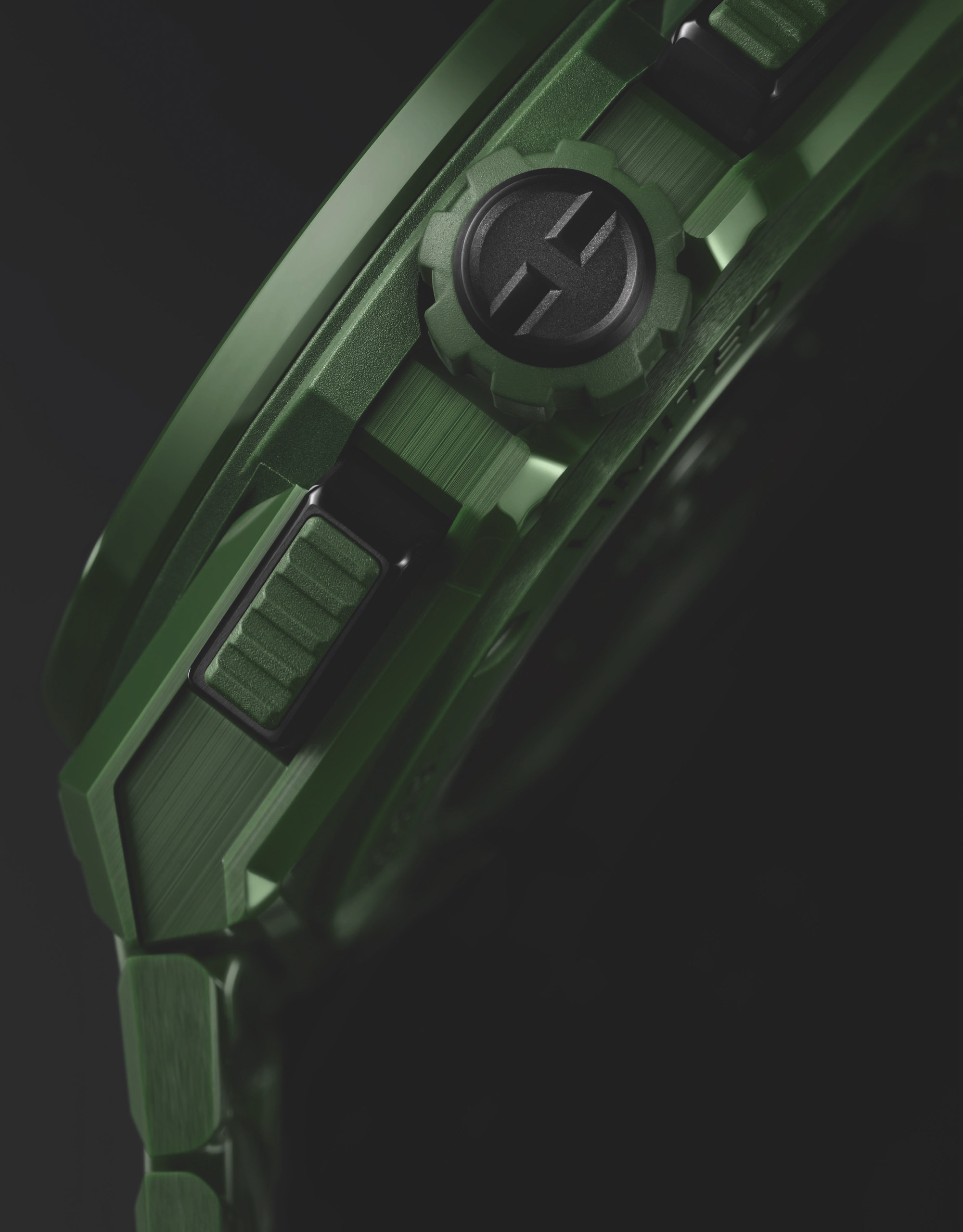 Big Bang Integral一体式陶瓷腕表设计融合一体式结构、单材质及单色配色, 于腕间演绎浑然天成的美学魅力。这款时计作品如何实现一体式设计?首先,腕表采用独特的一体式结构,将表链融入表壳设计。其次,腕表通体采用单一陶瓷材质。最后,腕表提供四种全新单色配色供选择:靛蓝色、天蓝色、沙米色以及丛林绿。